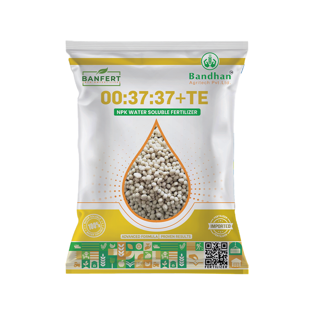 BANFERT 00:37:37 + TE is a fully water-soluble fertilizer containing 37% Phosphorus (Pâ‚‚Oâ‚…) and 37% Potassium (Kâ‚‚O), enriched with essential trace elements (TE). It is specially formulated to promote strong root development, uniform flowering, and improved fruit and grain formation. The high phosphorus content supports early plant growth, energy transfer, and root establishment, while the balanced potassium level enhances nutrient translocation, crop quality, stress tolerance, and overall yield. The added trace elements help prevent micronutrient deficiencies and ensure better metabolic activity and healthy crop growth.