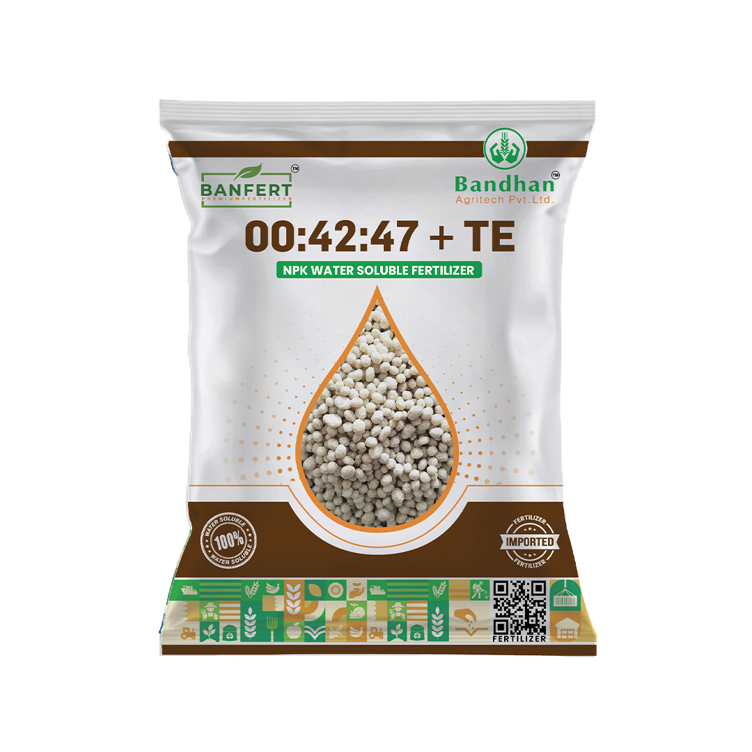 BANFERT 00:42:47 + TE is a fully water-soluble fertilizer containing 42% Phosphorus (P₂O₅) and 47% Potassium (K₂O), enriched with essential trace elements (TE). It is specially formulated to support flowering, fruit development, and crop quality improvement. The high phosphorus content promotes strong root development, energy transfer, and early crop establishment, while the high potassium level enhances flower initiation, fruit setting, size, colour, and shelf life. The presence of trace elements helps in preventing micronutrient deficiencies, improving nutrient uptake, and supporting balanced plant growth.