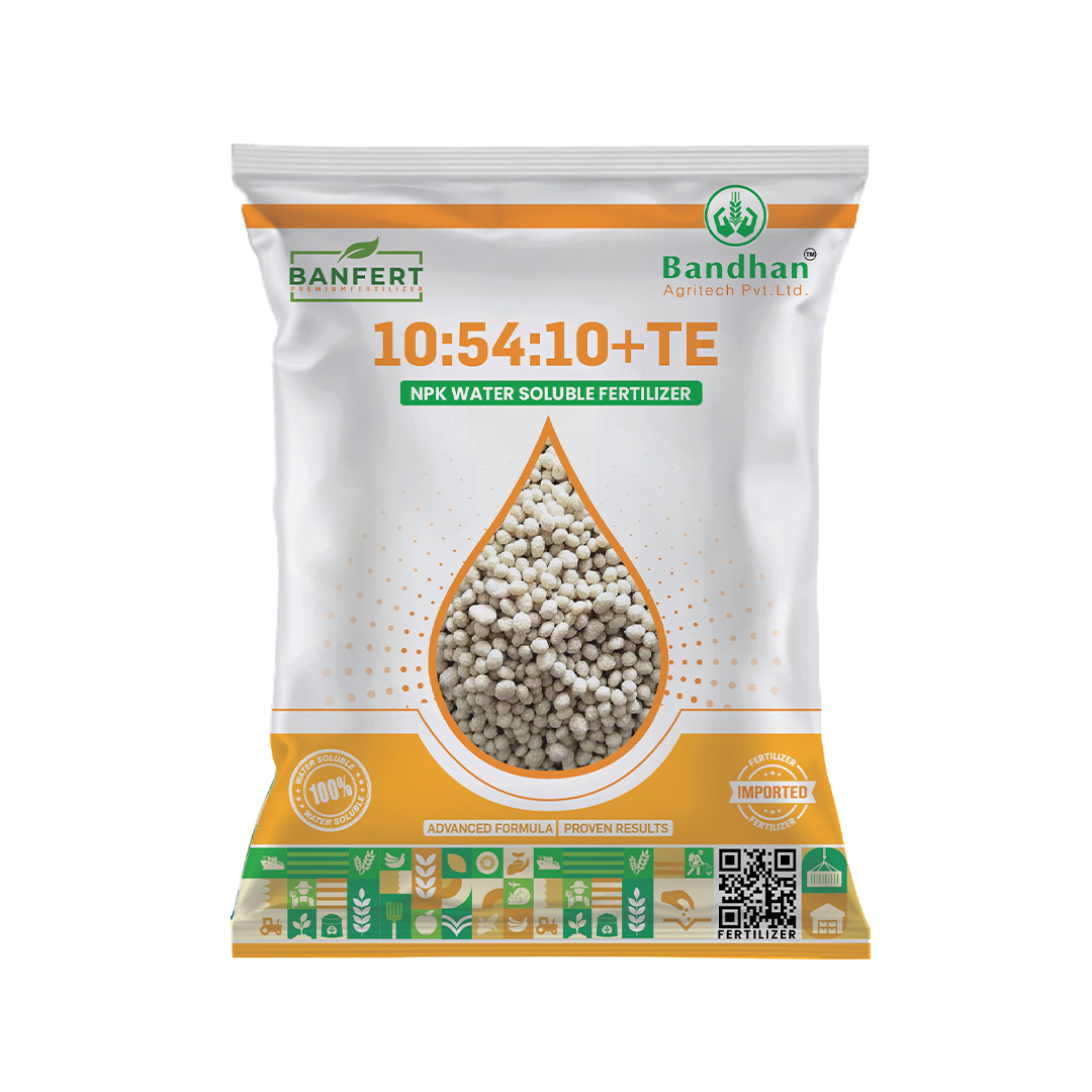 BANFERT NPK 10:54:10 is a fully water-soluble fertilizer formulated with a high phosphorus content to support strong root development, early crop establishment, and improved flowering. The presence of nitrogen helps in vegetative growth and chlorophyll formation, while potassium enhances plant vigor and improves stress tolerance.