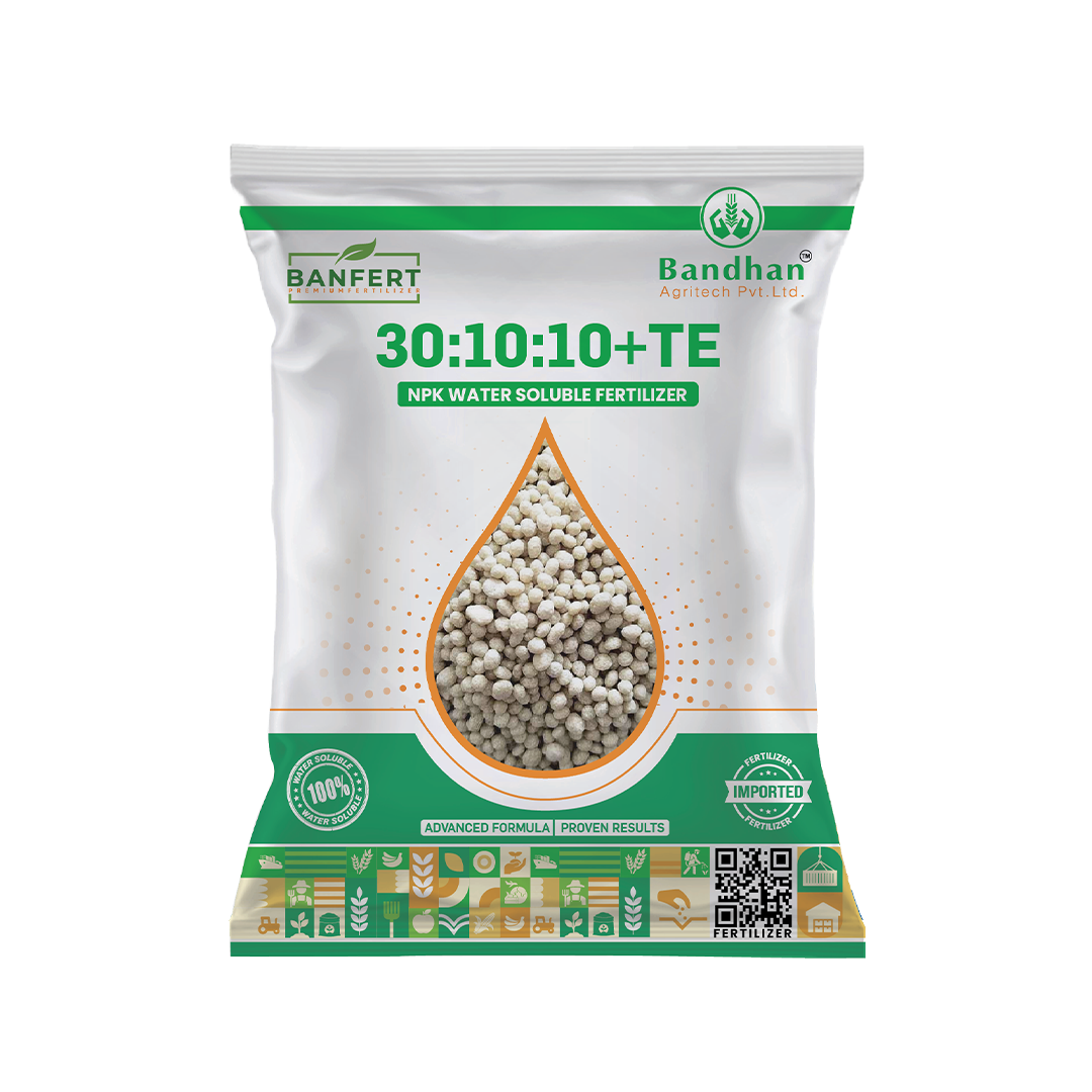 BANFERT NPK 30:10:10 + TE is a fully water-soluble fertilizer containing 30% Nitrogen (N), 10% Phosphorus (Pâ‚‚Oâ‚…), and 10% Potassium (Kâ‚‚O), enriched with essential trace elements (TE). The balanced nutrient composition supports vigorous vegetative growth, promotes strong root development, and enhances overall plant health. The high nitrogen content encourages rapid leaf formation and improved chlorophyll synthesis, while phosphorus supports early root establishment and energy transfer in plants. Potassium plays a key role in regulating physiological processes, improving nutrient uptake efficiency, and enhancing crop tolerance to environmental stress. The added micronutrients help prevent trace element deficiencies and support optimal crop growth and development.