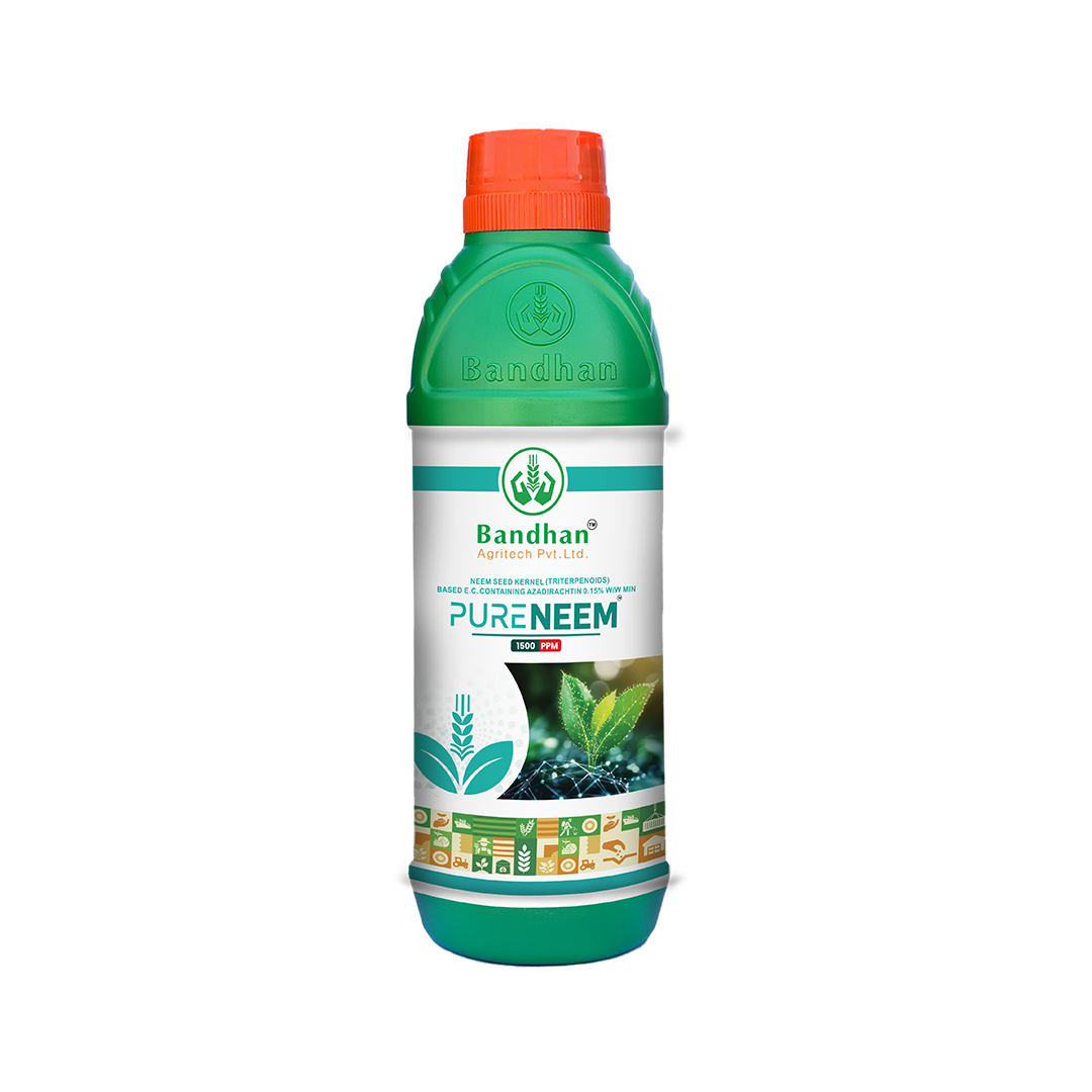 Pure Neem 1500 is a neem seed kernel–based botanical insecticide formulated as an Emulsifiable Concentrate (E.C.) containing Azadirachtin 0.15% w/w (1500 ppm) minimum. Derived from natural neem extracts rich in triterpenoids, it acts as an eco-friendly pest management solution. The product works as an antifeedant, repellent, and growth regulator, effectively disrupting the life cycle of harmful insects.