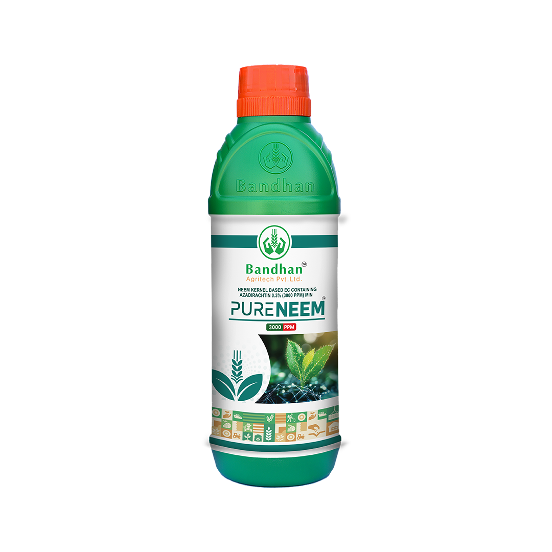 Pure Neem is a neem kernel–based botanical insecticide formulated as an Emulsifiable Concentrate (EC) containing Azadirachtin 0.3% (3000 ppm). It acts as a natural pest management solution that helps control a wide range of sucking and chewing insects in various crops. The product works by disrupting the feeding, growth, and reproduction of pests, thereby reducing pest populations and crop damage. Being derived from neem, it is eco-friendly, biodegradable, and suitable for integrated pest management (IPM) programs while ensuring safer crop protection and improved plant health.